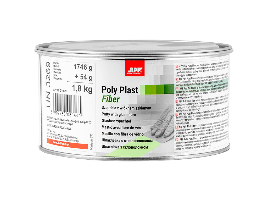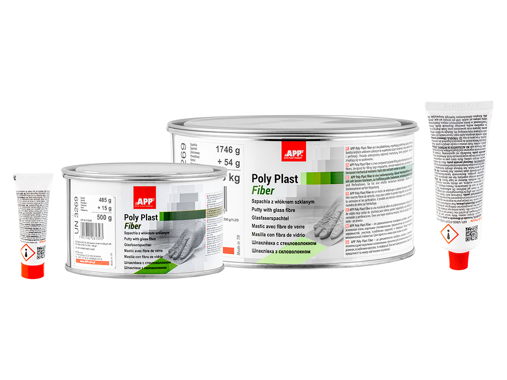 APP Poly Plast Fiber - Mastic binaire à base de polyester, renforcé avec des fibres de verre courtes. Il est idéal pour combler de grandes irrégularités, les endroits fragilisés par la corrosion et les petits trous, lors des réparations de carrosserie et peinture.