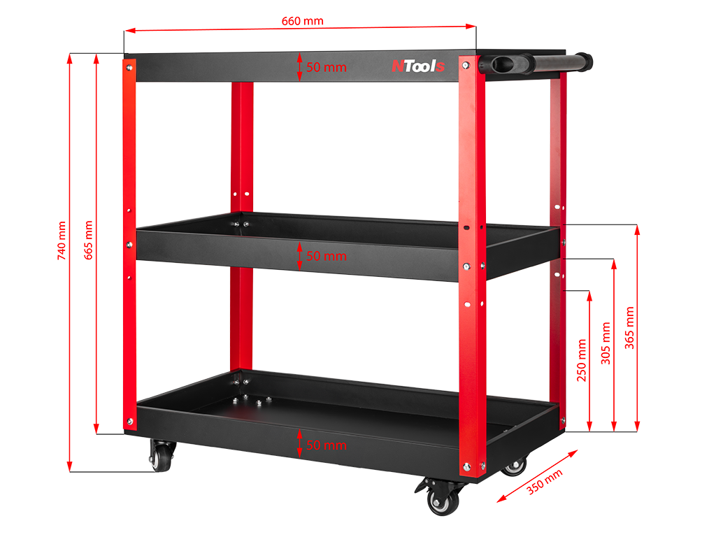 NTools L3S est un chariot d'atelier fonctionnel et solide, conçu pour une utilisation intensive dans les ateliers, les services et les garages. Fabriqué en acier durable, il offre une capacité de charge élevée (jusqu'à 100 kg) et une résistance aux dommages mécaniques. La construction avec revêtement en poudre assure la durabilité et la protection contre la corrosion.
