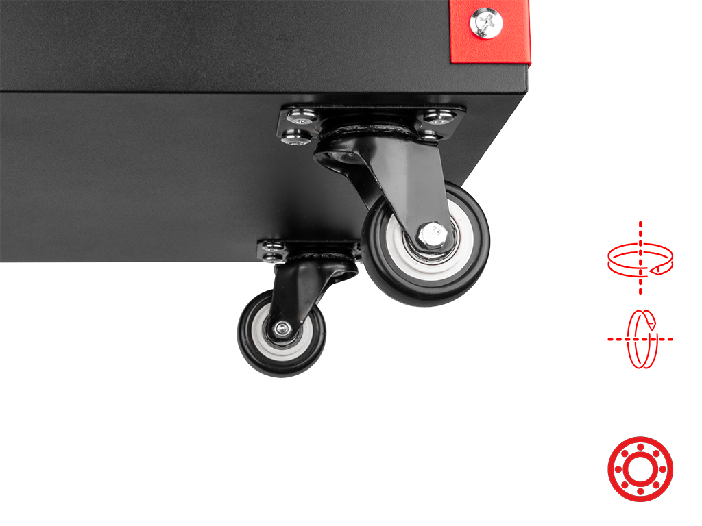 Le chariot est équipé de trois étagères profondes avec des reliefs qui stabilisent les outils stockés pendant le transport. L'étagère du milieu peut être montée sur l'un des trois niveaux, vous permettant de mieux adapter l'espace à vos besoins individuels. Quatre roues entièrement orientables à roulements à billes - dont deux avec freins - assurer un mouvement fluide même avec une charge plus lourde et un positionnement sûr du chariot à l'emplacement sélectionné.